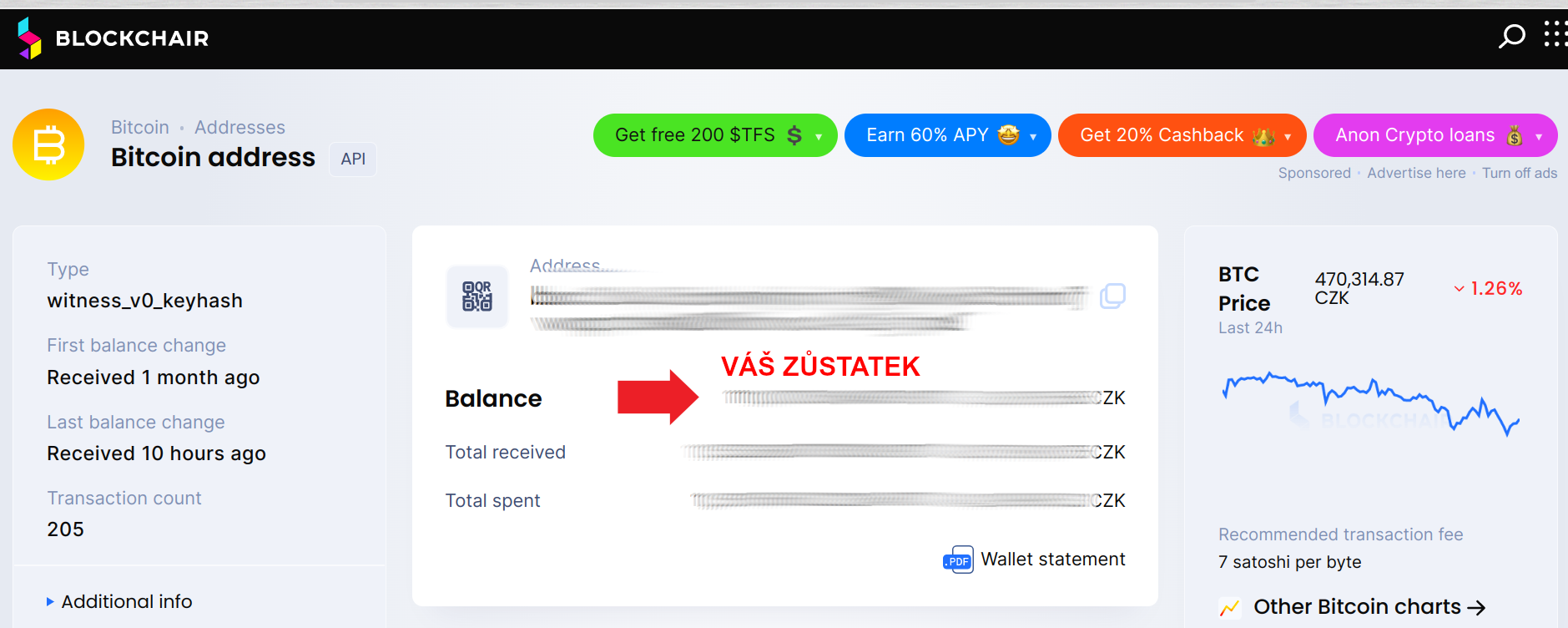 Abyste si ověřili, že ve Vaší peněžence skutečně máte objednanou částku, stačí zadat adresu Vaší peněženky (to je ten dlouhý řetězec v e-mailu s potvrzením objednávky, nebo v přiloženém certifikátu) do příslušné on-line služby, která slouží k ověřování stavu peněženek v síti blockchain. Pro každou kryptoměnu existuje jiná služba: